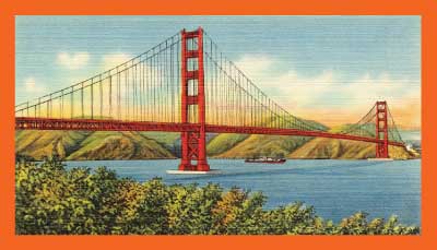 The Golden Gate Bridge is famous the world over. Located in the state of California, it connects San Francisco to nearby Marin County. The picture you see here is a drawing that appeared on a old postcard. As you can see, the bridge was — and still is — big, beautiful, and amazing.