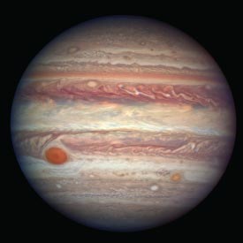 This photograph of Jupiter, which was taken by the Hubble Space Telescope, features the planet’s amazing red spot (on the lower left). The red spot is actually a huge storm that’s been going on for at least 150 years. With winds over 400 miles per hour, it’s a storm that would do great damage to the surface of Jupiter if Jupiter had a surface. But it doesn’t. Jupiter is a huge ball made mostly of gas, so it doesn’t have a hard outer surface.